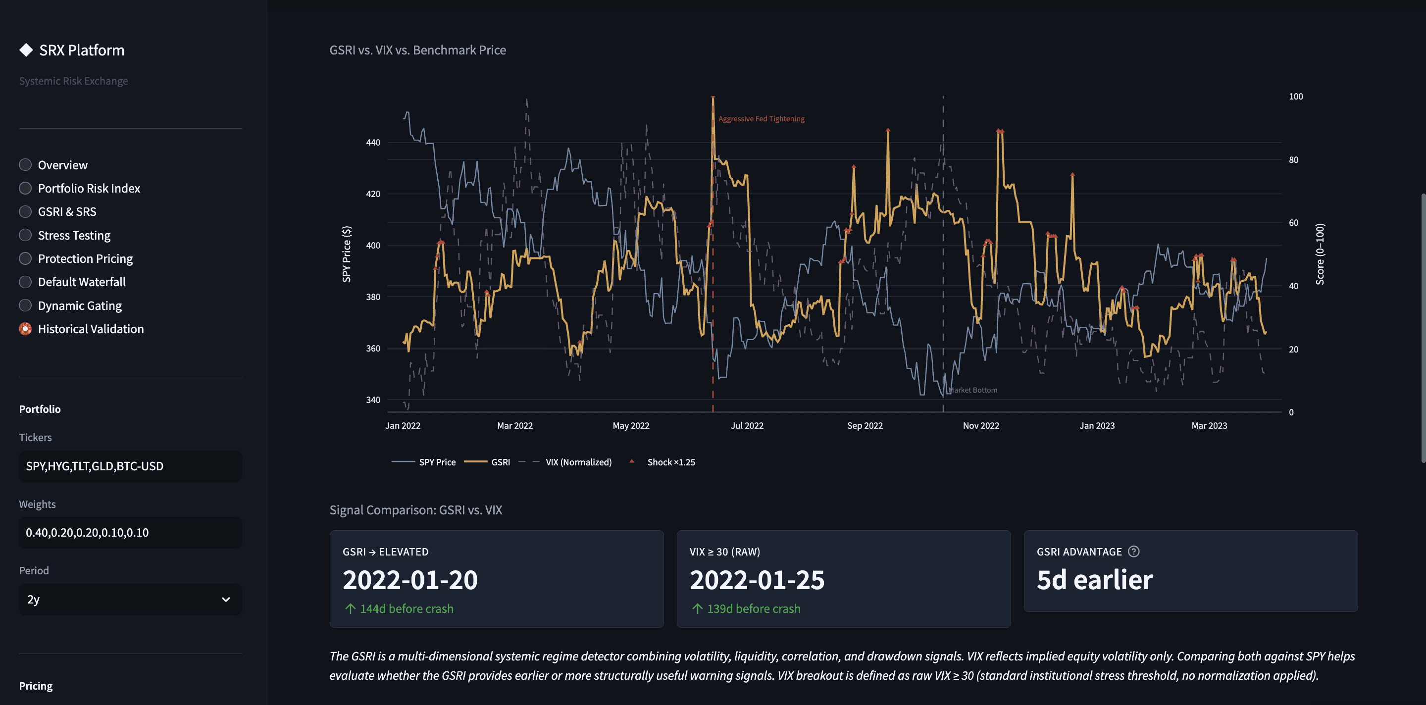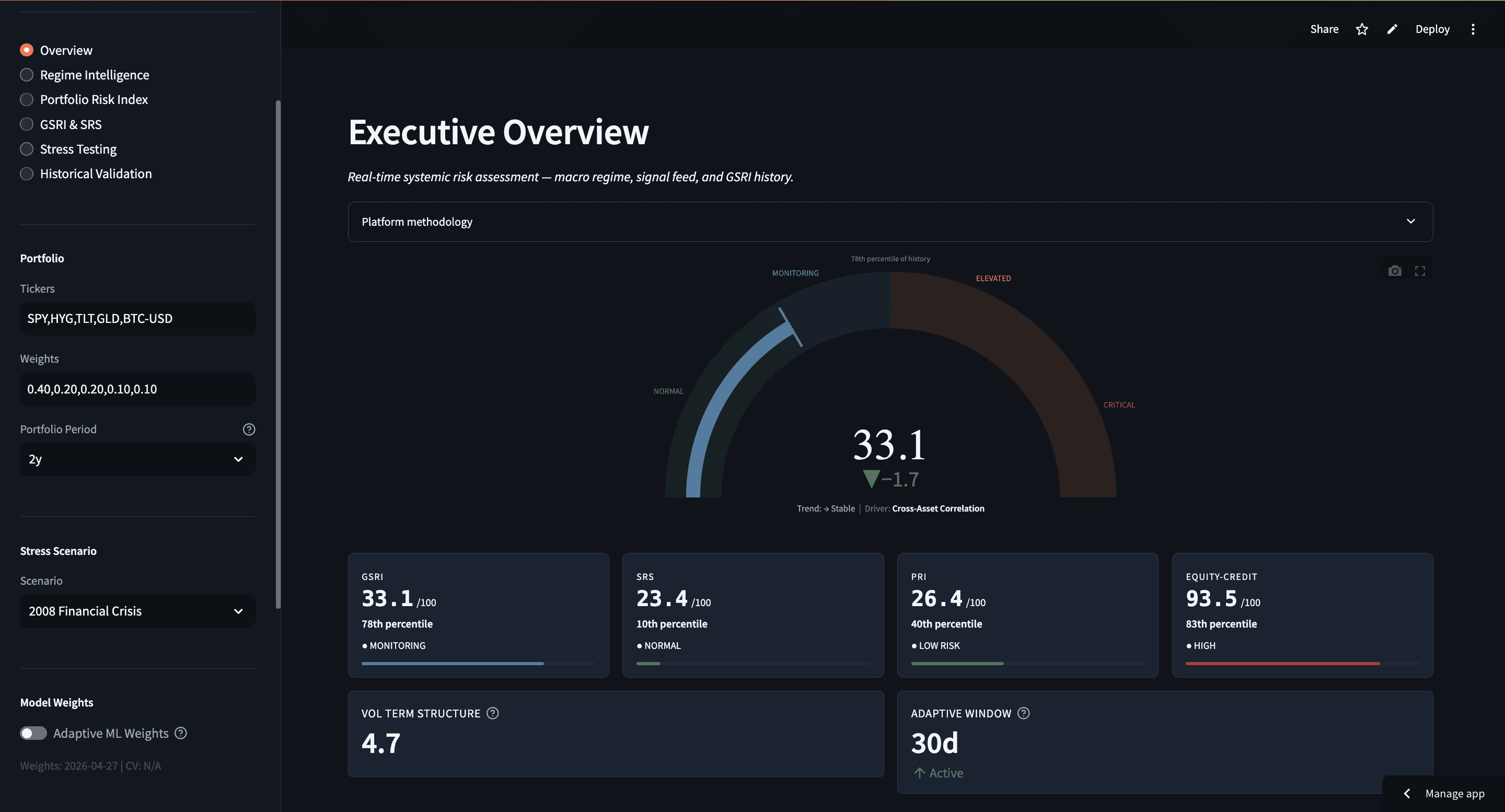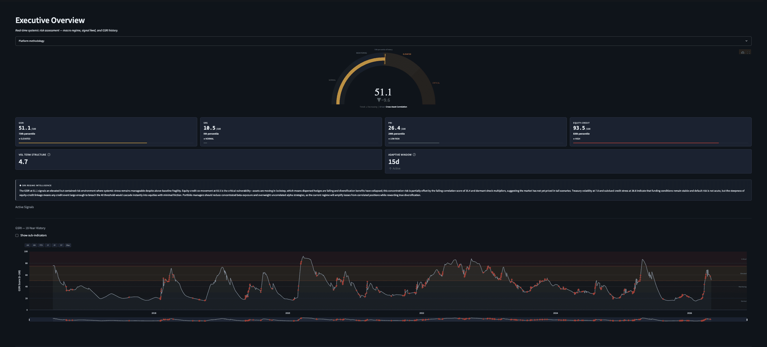 Full GSRI monitor with 10-year history, SRS signal decomposition, portfolio stress testing across five scenarios, historical crisis validation across 13 periods, regime intelligence, ML weight comparison, and one-click PDF report generation. Input your own holdings to see portfolio-specific impact.